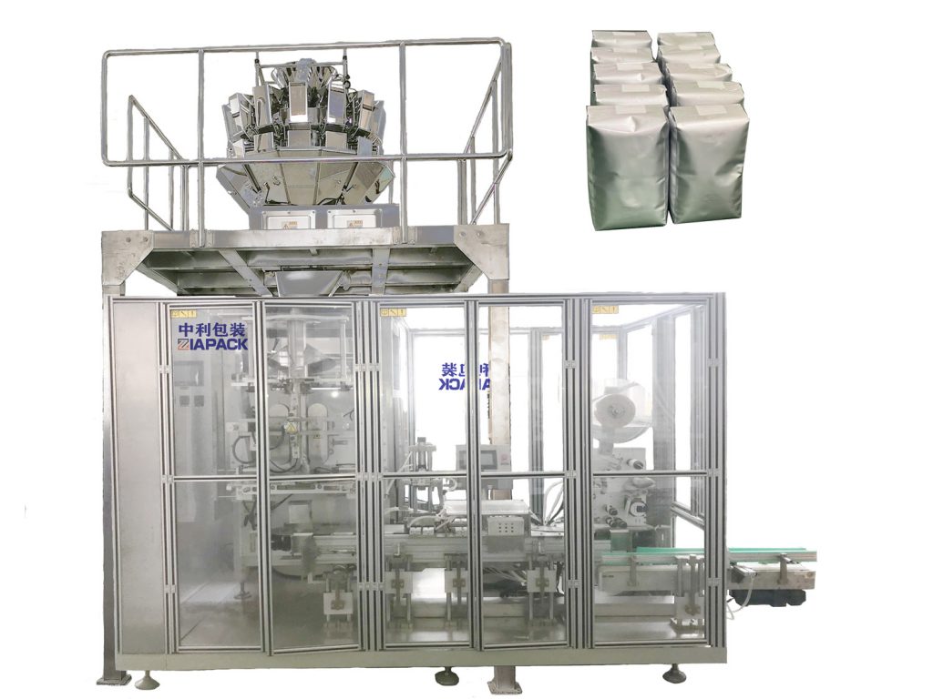 Ολόκληρη η σειρά, συμπεριλαμβανομένης μιας μηχανής σφράγισης πλήρωσης που σχηματίζει τσάντες vffs, μια μηχανή συσκευασίας με αυτοκόλλητες τσάντες σετ, μια μηχανή ελέγχου βάρους και μεταφορέα buffer και μια μηχανή περιτυλίγματος συρρικνωμένης μεμβράνης. και παραμόρφωση. Υπάρχει μια επιπλέον προαιρετική λειτουργία για την προσθήκη κενού σακούλας σε αυτό το μηχάνημα μονάδας.