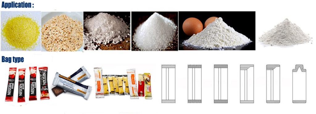 Αυτό το μηχάνημα χρησιμοποιείται κυρίως για τη συσκευασία προϊόντων σε σκόνη: όπως σκόνη γάλακτος, σκόνη γάλακτος τσαγιού, σκόνη καφέ, μπαχαρικά, σκόνη κάρι, σκόνη πρωτεΐνης, καρυκεύματα, βότανα, χημικά και ιατρικά προϊόντα σε σκόνη.
