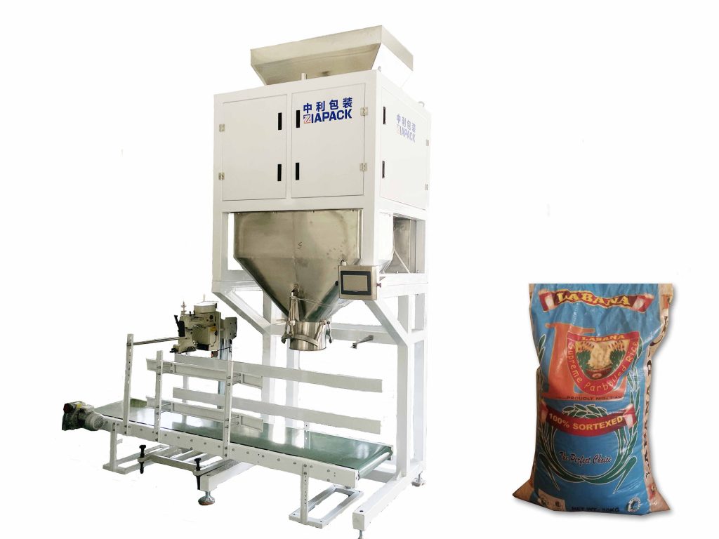 Αυτή η μονάδα μηχανής περιλαμβάνει ένα σετ μηχανή ζύγισης με διπλούς κάδους για μέτρηση 30-50 κιλών. Ένα σετ μεταφορέα εξόδου 3 μέτρων, ένα σετ μηχάνημα σφράγισης θέρμανσης σακούλας PE και ένα σετ μηχάνημα ραφής σακούλας γιούτας. Ολόκληρο το μηχάνημα μπορεί να ζυγίζει αυτόματα το τελικό προϊόν, το γέμισμα του προϊόντος, το αυτόματο ράψιμο σακούλας και θερμοσφράγιση. Χρειάζεται μόνο χειροκίνητη τροφοδοσία της τσάντας.
